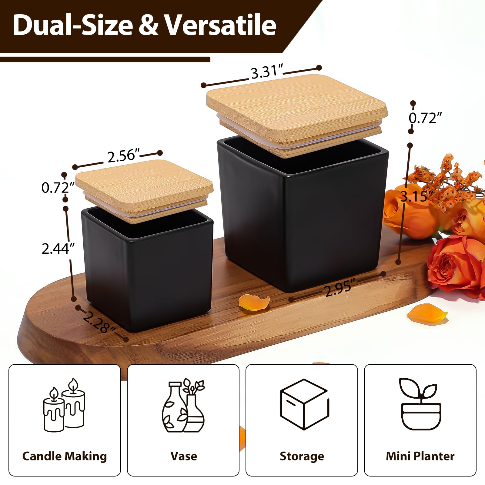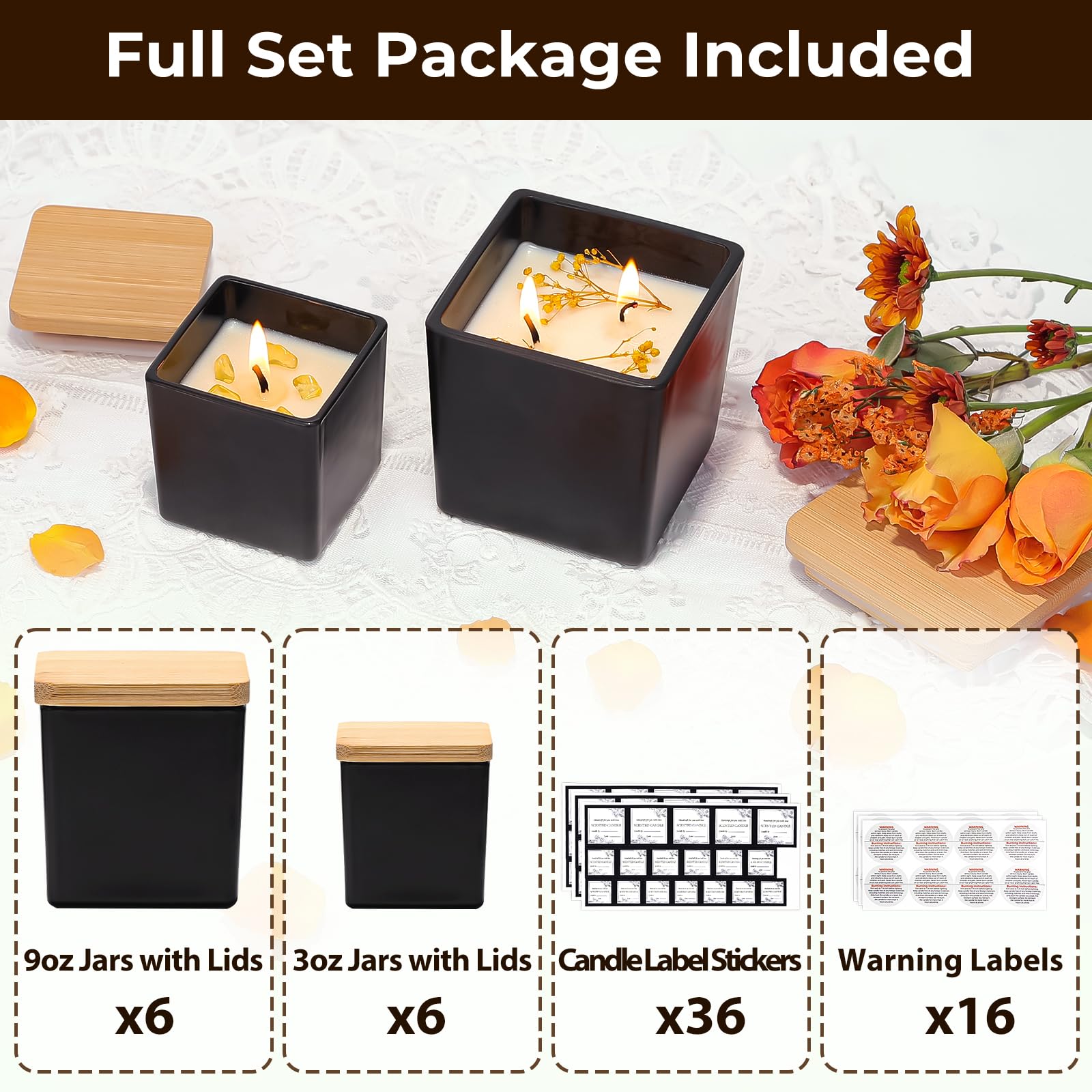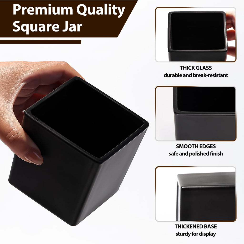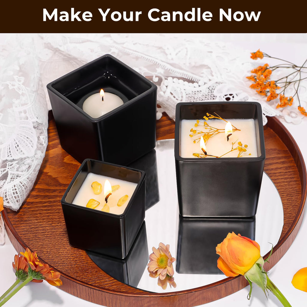CONNOO 12 Pack 9oz, 3oz Matte Black Square Candle Jars for Making Candles, Thick Glass Bulk Empty Candle Containers with Airtight Bamboo Lids for Candle Making, Sticky Warning Labels - Dishwasher Safe