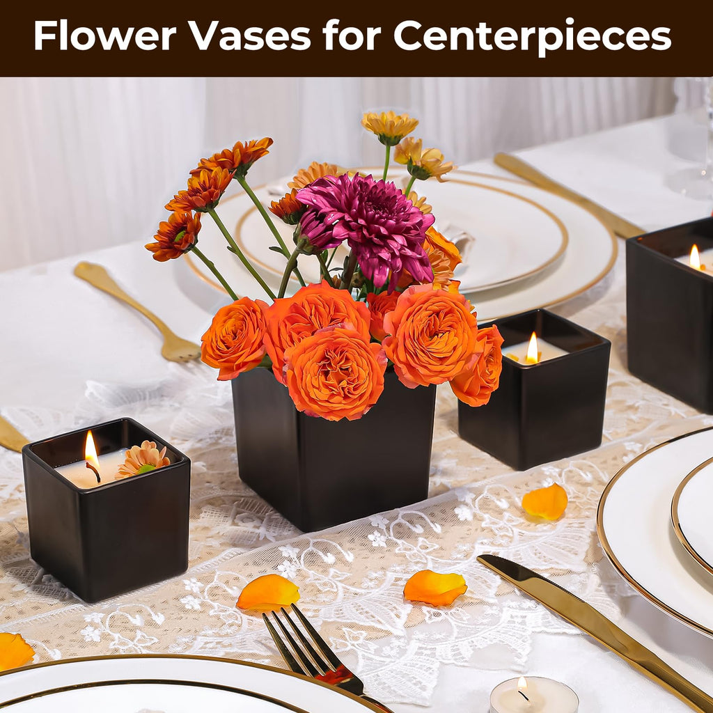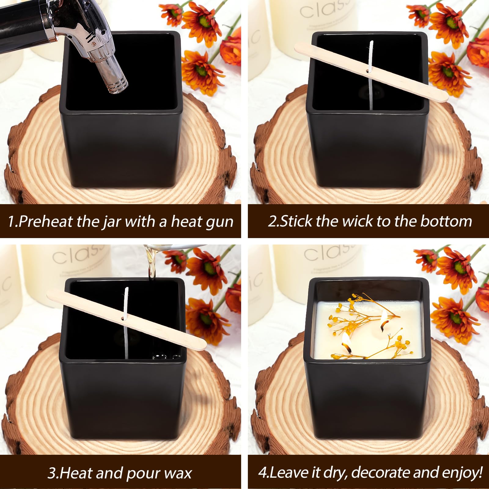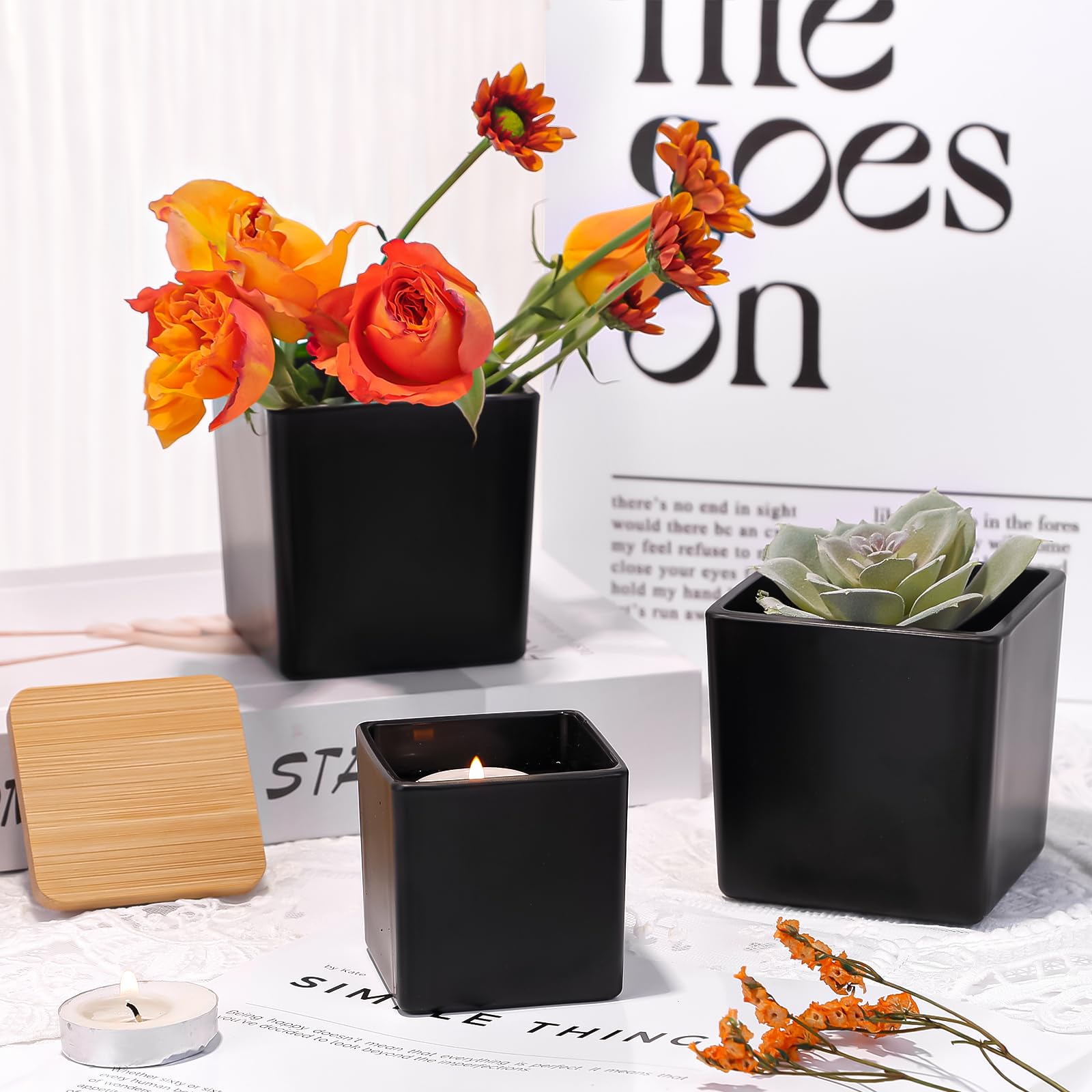 CONNOO 12 Pack 9oz, 3oz Matte Black Square Candle Jars for Making Candles, Thick Glass Bulk Empty Candle Containers with Airtight Bamboo Lids for Candle Making, Sticky Warning Labels - Dishwasher Safe