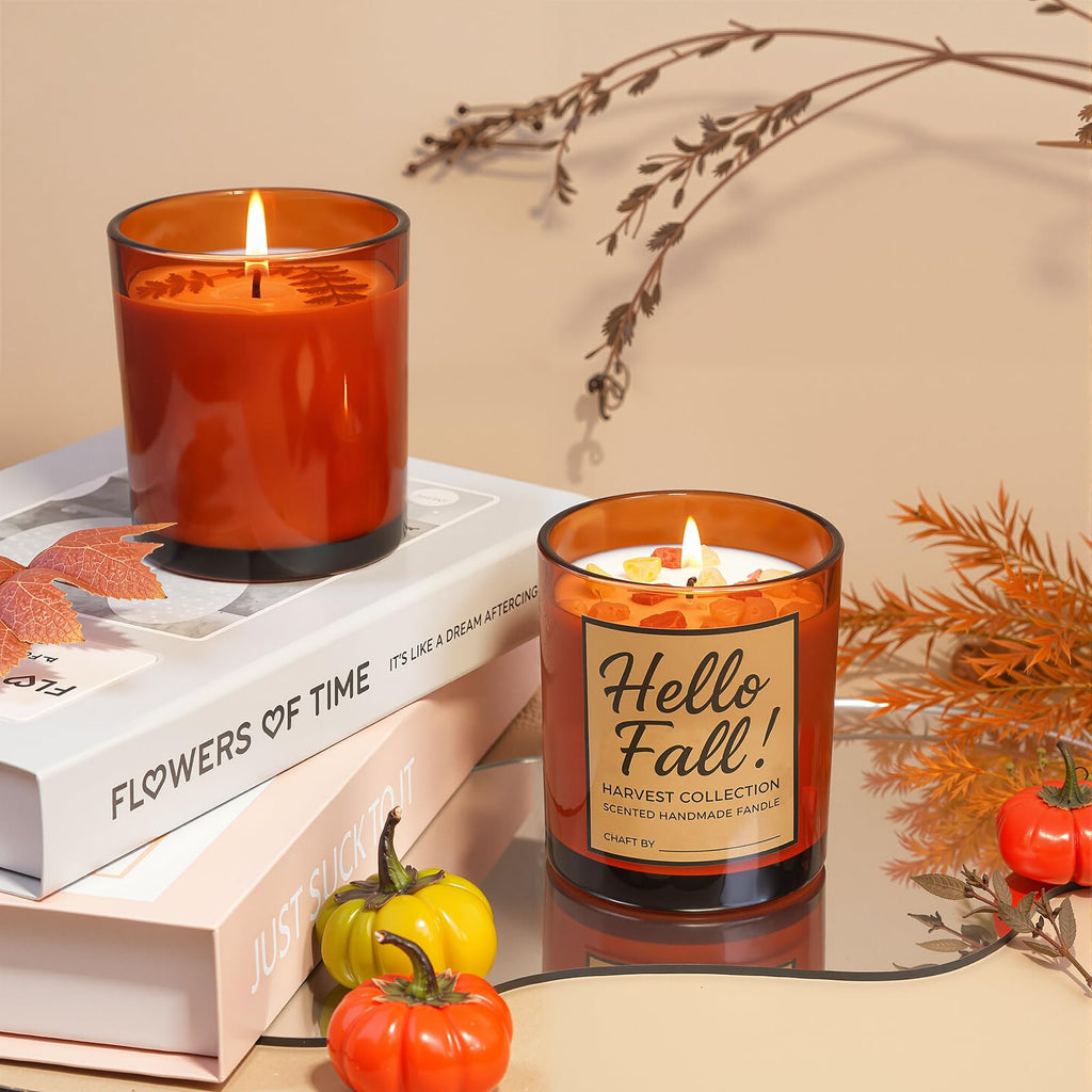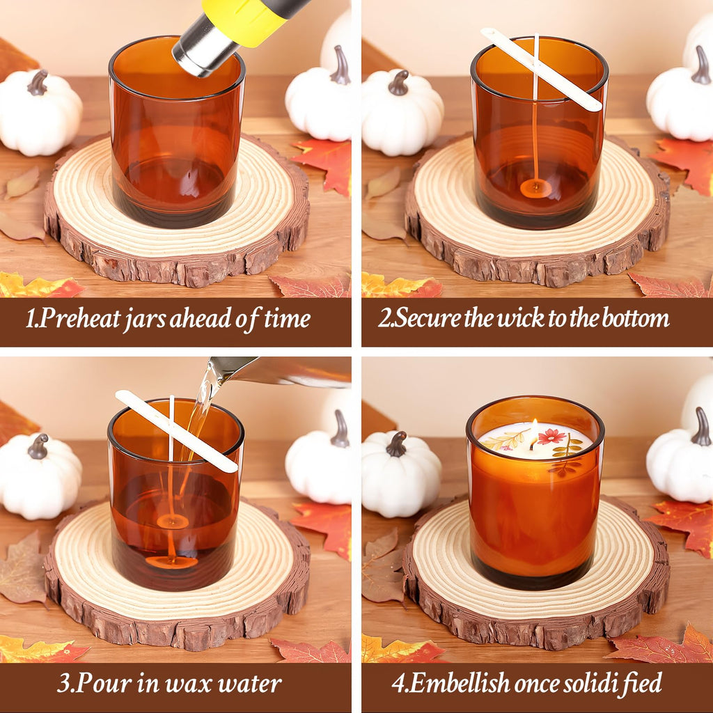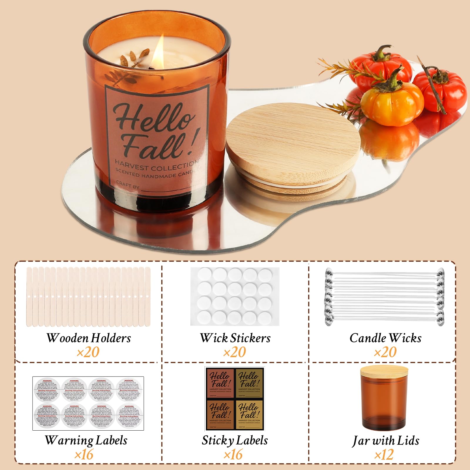 - đ Value Candle Making Kit â Celebrate the Season: You'll receive 12 x 10 oz amber glass candle jars with bamboo lids, 20 wicks, 20 wick stickers, and 20 wick holdersâeverything you need to get started. To capture the cozy essence of fall, weâve included 16 Fall Sticky Labels beautifully printed with the festive phrase âHello Fallâ, plus 16 safety warning labels. Itâs the perfect set for warm, autumn-inspired candle creations that fill your space with seasonal charm.