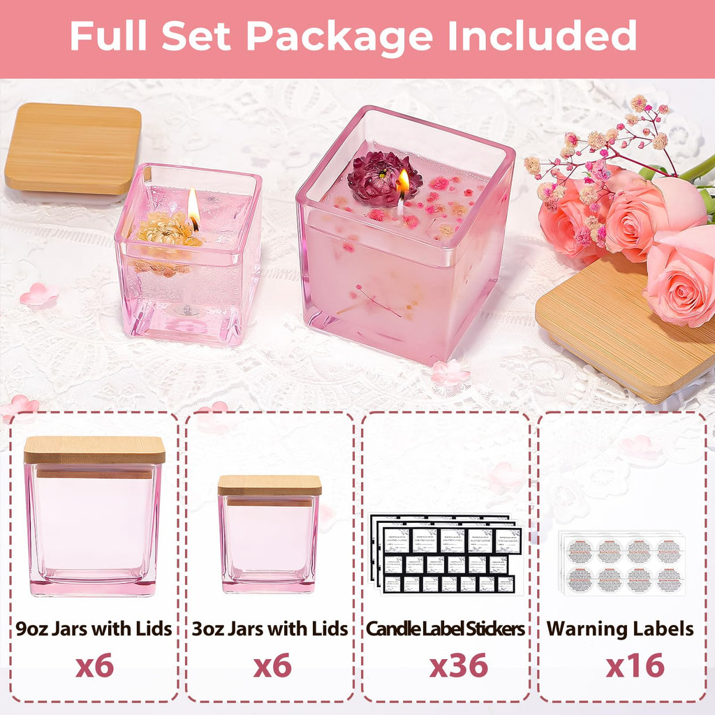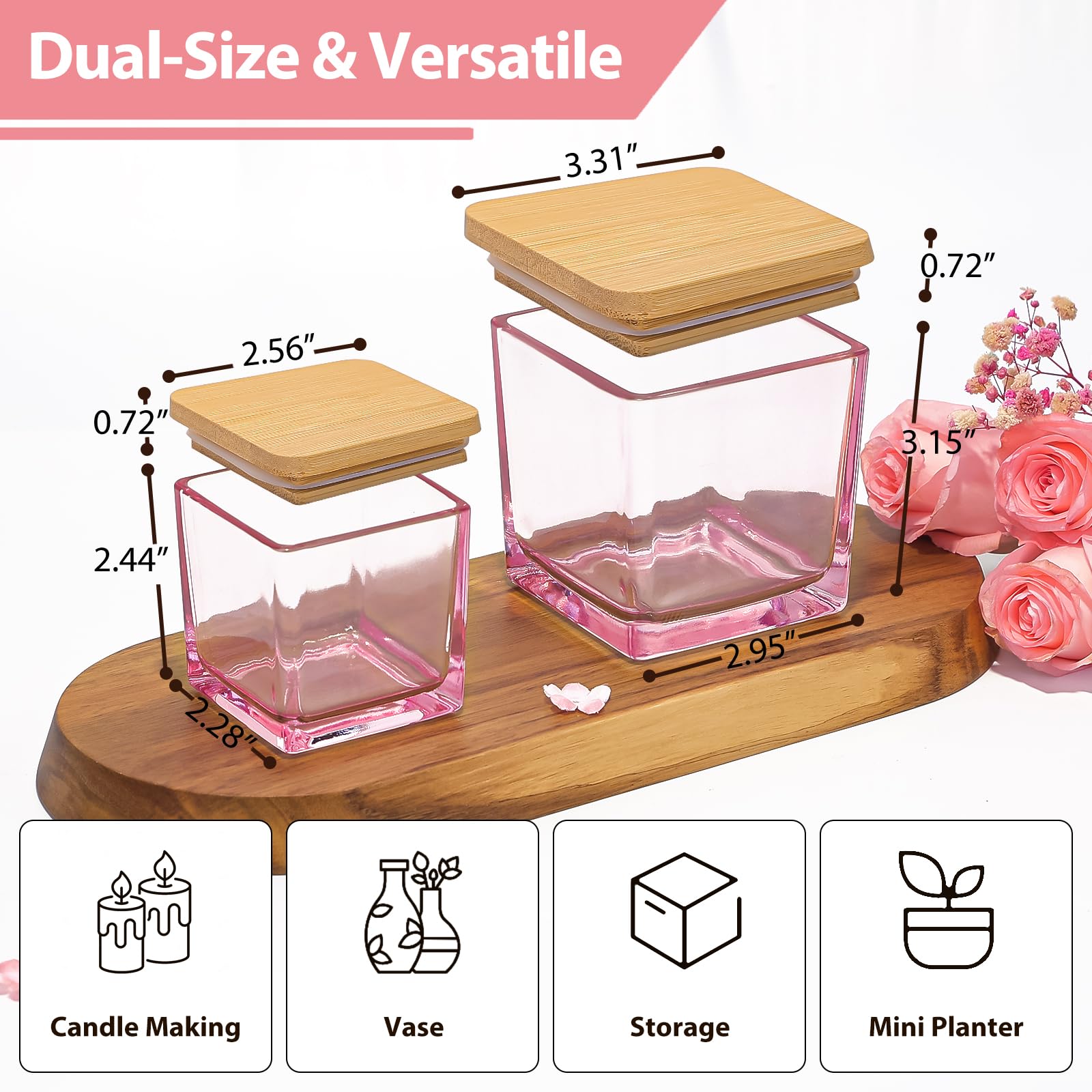 CONNOO 12 Pack 9oz, 3oz Pink Square Candle Jars for Making Candles, Thick Glass Bulk Empty Candle Containers with Airtight Bamboo Lids for Candle Making, Sticky Warning Labels - Dishwasher Safe